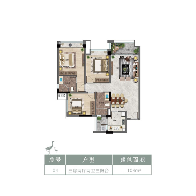 D户型 建面104㎡三房两厅 朝东/朝西/朝北户