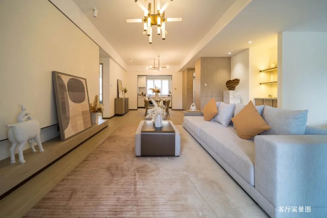 餐厅、客厅与约6.8m宽度休闲大阳台形成一线贯通的开阔视野,将山麓景色与明亮日光充分引入室内,内外景色相映衬,更显山居环境静谧、氛围舒心。